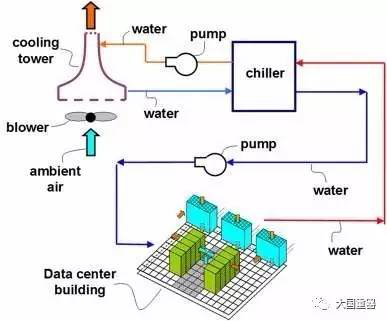 计算机室内空气冷却(CRAC)和计算机室内空气处理器(CRAH)单元,类似于今天数据中心的热沉,将冷却的空气吹过服务器的多个列。该冷却的空气由基于压缩机的冷却装置(类似汽车的空调)提供。该冷却装置通过在数据中心外部顶层的冷却塔移走热量。将该塔想象为一个巨大的将热量抽入空气中的散热片,如下图所示。这循环占据了数据中心成本的1/3,IBM一直希望能够减少这部分的能量损耗。