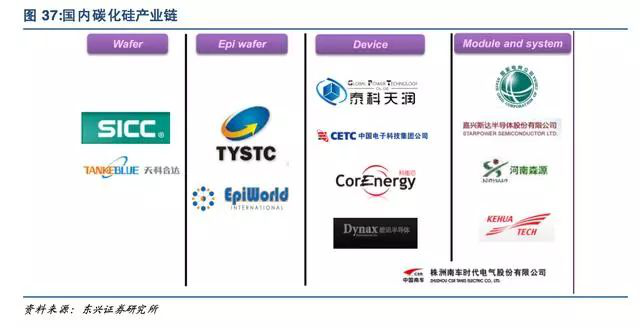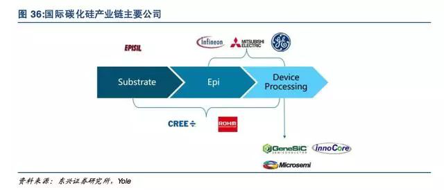 EPI外延片:Cree、Rohm、英飞凌、GE、三菱器件:英飞凌、Cree、Rohm、意法半导体、美高森美、GenSiC、三菱