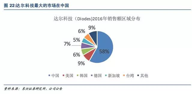 功率二极管国际一线品牌厂商达尔科技58%的收入来自中国,功率器件领导品牌NXP有41%的收入来自中国。