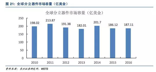 目前国内厂商市占率不足1%,国产替代空间巨大。根据WSTS(全球半导体贸易统计协会)数据,全球功率分立器件市场容量2016年为187亿美金。