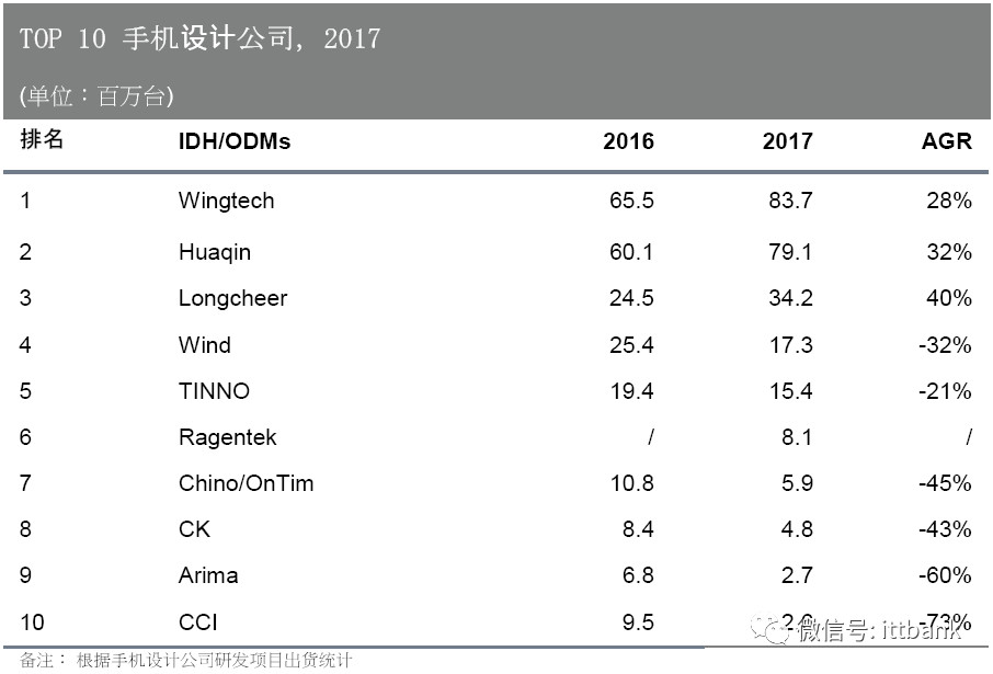 智能机出货部分,闻泰2017年继续保持其行业领头羊位置,2017年智能机出货达到8370万部,同比增长28%。闻泰是2017年小米和华为出货增长的主要受益者,其中小米订单出货增长超过30%。参与的畅销机型包括与小米合作红米4/5系列,华为畅享6系列和荣耀畅玩6A系列,联想Moto C/G系列和魅蓝6/Note6系列,出货量均在百万以上级别。华勤2017年智能机出货略少于闻泰,达到7910万部,同比增长32%。主要增长来自于小米ODM项目出货增长,2017年红米系列机型整体出货超过2000万部。龙旗2017年智能机出货3420万部,同比增长40%,出货增长来自于红米Note4/5系列和联想Moto E系列出货增长。与德2017年智能机出货下滑,主要受到魅族项目出货下滑以及中兴ODM项目收缩的影响。天珑2017年智能机出货下滑,同样受到海外客户Micromax, LAVA和Reliance等客户订单下滑的影响,其旗下品牌Wiko和Sugar整体出货小幅下滑。