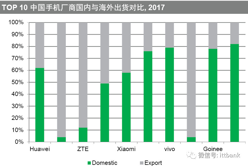 根据IHS Markit智能机出货数据,2017年中国手机厂商海外市场出货增长11.7%,其中华为,OPPO, vivo和小米2017年在海外市场出货均大幅增长。联想,TCL和中兴智能机出货主要集中在海外市场,出货以中低端机型为主。预计2018年华为,OPPO,vivo和小米在海外市场仍然有非常大的增长空间。