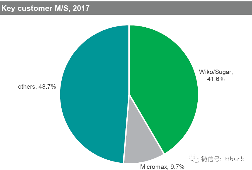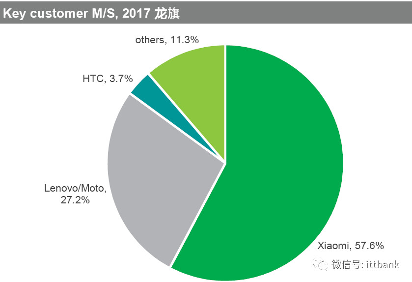 龙旗2017年智能机出货3420万部,同比增长40%,其中小米出货占比最大,占比接近60%,明星机型红米Note4整体出货接近1000万部;另外,联想Moto E项目出货接近1000万部,成为了龙旗2017年智能机出货的主要增长点。相对其他客户如HTC,美图,Micromax等客户市场表现不佳,整体出货下滑。