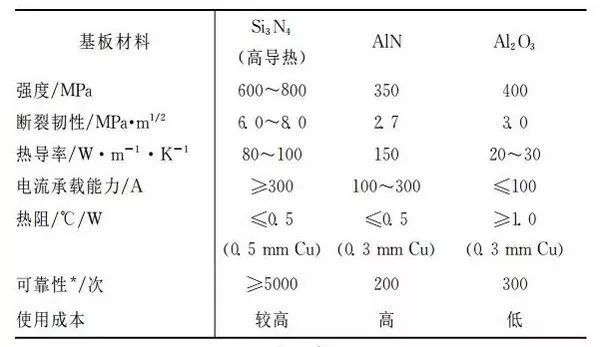 从表中可以看出,Si3N4陶瓷的抗弯强度、断裂韧性都可达到AlN的2倍以上,特别是在材料可靠性上,Si3N4陶瓷具有其他二者无法比拟的优势。