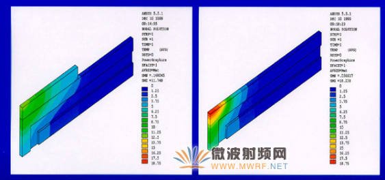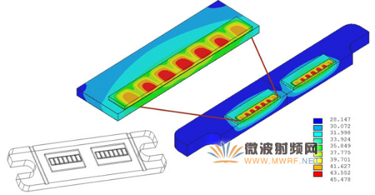 图5. (a) 在接合到CuW 法兰的BeO 散热片上集成分立式射频器件的射频封装模拟。
