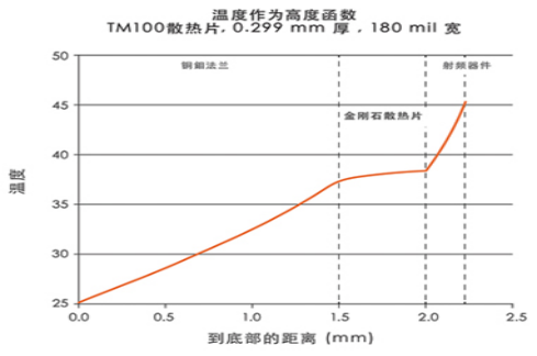 另一示例是由分立式射频器件组成的射频封装,这些射频器件连接到CuW法兰上安装的1 mm厚氧化铍散热片上。氧化铍有毒且热导率仅约为200 Wm¯ˡK¯ˡ。热学模型(图5)表明用300 µm 厚的TM100 CVD 金刚石替代氧化铍可使热阻下降30%。由红外摄像头采集的整个封装温度下降测量结果显示了整个器件和CuW 法兰温度下降最大值,同时也显示了金刚石层温度下降几乎可忽略。目前该产品已大批量生产,借助CVD金刚石使相同结温下输出提高40%。