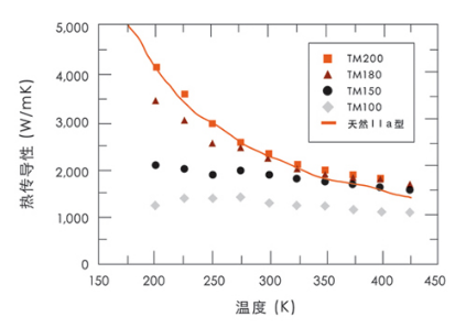 高级产品在低于室温条件下的热性能更具优势,温度低至100°K时热导率显著提高。图2中TM180 和TM200 等级显示的性能与温度变化趋势与IIa 型天然金刚石类似。