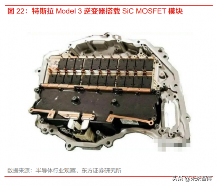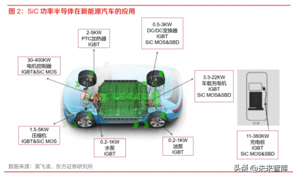 众多新能源汽车厂商竞相布局 SiC 器件。2018 年,特斯拉的 Model 3 首次采用意法半导体和英飞 凌的 SiC 逆变器取代了 Si-IGBT,逆变器效率提升了 5-8%。2020 年,比亚迪将自主研发制造的 SiC MOSFET 功率器件搭载在汉 EV 四驱高性能版上,实现了 200KW 的输出功率,功率密度提 升一倍。预计到 2023 年,比亚迪将实现 SiC 基车用功率半导体对硅基 IGBT 的全面替代,将整车 性能在现有基础上再提升 10%。目前,已有多家厂商推出了面向 HEV/EV 等电动汽车充电器的SiC 功率器件。未来随着 SiC 器件在车载充电器、DC/DC 转换以及充电桩中渗透率提升,市场空 间有望快速扩大。