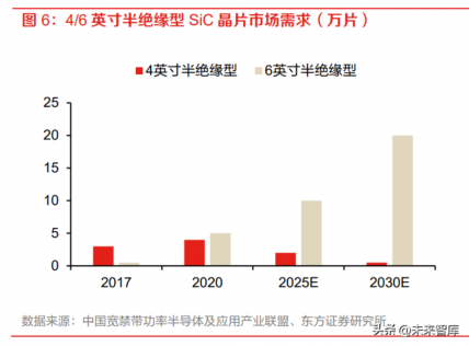半绝缘型 SiC 衬底市场增长迅速,6 英寸晶片成为发展趋势。受益于 5G 基建加快布局和全球地 缘政治动荡,半绝缘型 SiC 衬底市场增长空间巨大。根据 Yole 数据,2020 年全球半绝缘型 SiC 衬底市场规模为 1.8 亿美元,较 2019 年同比增长 18%。此外,根据中国宽禁带功率半导体及应 用产业联盟数据,2020 年全球 4 英寸半绝缘型 SiC 晶片的市场需求约 4 万片,6 英寸约 5 万片, 两者需求占比不相上下;预计到 2025 年,4 英寸市场需求将减少至 2 万片,6 英寸成为发展趋势。