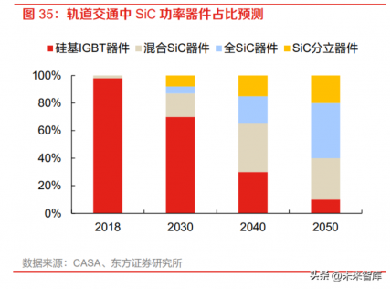 在大容量、轻量化和节能化要求下,轨道交通领域采用 SiC 大势所趋。随着轨道交通硅基功率器 件性能逐渐逼近理论极限,SiC 功率器件成为重点发展方向,以满足轨道交通系统对高功率密度、 低损耗和高可靠性等要求。与传统硅基 IGBT 牵引逆变器相比,全 SiC 牵引逆变器能耗能够降低 10%以上。2014 年日本小田急电铁新型通勤车辆配备了三菱电机 3300V/1500A 全 SiC 功率模块逆变器,开关损耗降低 55%,体积和重量减少 65%,电能损耗降低 20%~36%。根据 CASA 预 测,未来 30 年内,轨道交通应用中 90%的硅 IGBT 将被 SiC 器件或混合器件替代。Yole 数据显 示,铁路 SiC 市场将从 2019 年的 900 万美元增长到 2025 年的 1.18 亿美元,CAGR 达到 55%。