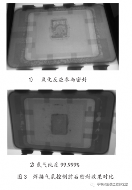 在密封过程中,一般要求真空炉内真空度小于1.0Pa,氮气纯度在 99.999% 以上,以避免在焊接过程中,氧化反应参与到共晶反应当中,在焊料表面形成氧化膜,阻碍金锡焊料与母材的浸润。图 3 为焊接气氛控制前后密封效果对比。