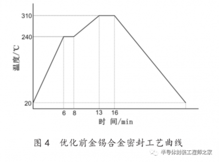 图 4 是某型号 DIP8 电路优化前金锡合金密封的工艺曲线,通过现有工艺曲线在进行电路密封时,最大空洞的宽度占设计宽度的 20% 左右。通过大量工艺曲线优化实验发现,在温度曲线中,峰值温度对密封空洞的尺寸大小有非常大的影响,其余条件对空洞影响则较小。