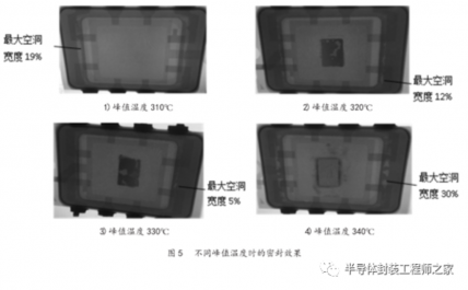从结果可以看出,峰值温度在 330℃时,密封后电路空洞的大小和数量要优于其他峰值温度密封后电路。