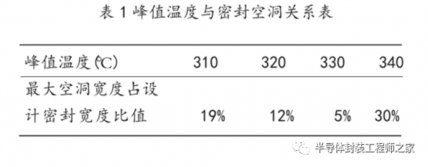 研究在原有工艺曲线基础上,针对焊接峰值温度设计了专项的优化方案,从 310℃至 340℃之间按每 10℃一个温度梯度设置优化试验方案,观察空洞率的变化。图 5 给出了不同峰值温度时的密封效果对比。表 1 是不同峰值温度时,最大空洞宽度占设计密封宽度的比值。