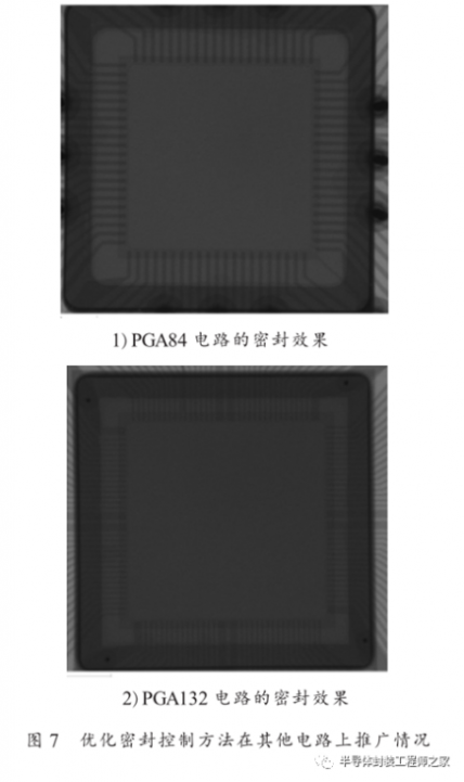 根据优化后的密封控制方法,以 PGA84 和PGA132 封装形式的外壳为例,对密封效果进行了X 射线照相验证, 图 7 是 X 射线照相检验结果图。从图中可以看出,两种封装形式密封的效果良好,最大空洞宽度占设计宽度的 5% 以下,可见,研究结果可以推广到同类产品之上。