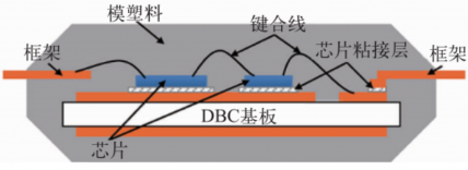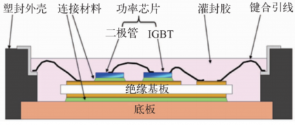 典型的功率模块封装结构如图1所示,由功率芯片、连接材料、键合引线、陶瓷基板、底板、灌封材料、外壳和功率端子等组成[3,5]。各封装材料的热、电、机械和化学性质不同,因此在封装时需要综合考虑各材料的性能进行选择,使整个功率模块达到最优的性能。