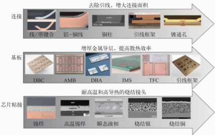 芯片粘接、连接和基板等关键封装材料与技术的发展趋势如图2所示。连接技术从键合引线向带状、铜柱、引线框架和电镀通孔等方向发展,通过去除引线、增大连接面积来提高导热和导电性能。芯片粘接材料从传统锡焊向金基高温钎焊、瞬态液相连接、烧结银和烧结铜等方向发展,大幅提高导热和导电性能,满足高温可靠应用。基板向着增厚陶瓷基板的金属导电导热层发展,从而提高散热效率[5]。