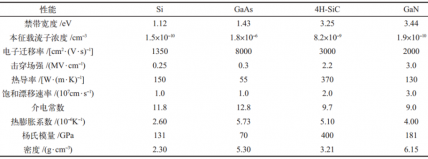 常用半导体材料的性能参数如表1所示[6-7]。Si因为技术成熟和成本低等特点,目前被广泛应用在各类分立器件和集成电路、电子信息网络工程等领域。相比于Si,GaAs具备禁带宽度大、电子迁移率高的特性,能显著减小射频尺寸、降低功耗,在射频、无线通信和光电子领域的中低功率器件方面得到广泛应用。SiC和GaN具有更大的禁带宽度,在高温工作时不易吸收热辐射能量跳变到导带,并且具有更高的击穿场强,所以宽禁带半导体SiC和GaN比Si更适用于高温和高压场合。SiC的热导率更大,散热能力更好,具有较高的载流子迁移率,能够提供较高的电流密度,并且耐高温、耐高压,因此常被用做功率器件,在电压600 V及以上的高功率领域具有显著优势,在新能源汽车和电力设备等领域应用广泛。GaN的电子迁移率和载流子速度更快,在高压时的导通电阻和寄生参数更小,在高功率射频方向具备明显优势。因为GaN具有高功率密度、低能耗、适合高频率、支持更宽带宽等特点,主要用于5G通信和卫星通讯等微波射频领域、消费电子快充和新能源汽车等电力电子领域以及LED光电子等领域。与SiC类似,目前GaN技术仍在快速发展阶段,成本相对较高。