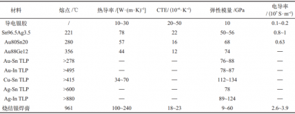 目前应用最广泛的芯片粘接材料如表2所示[8]。导电银胶主要由树脂基体、导电粒子(主要为银粉)和分散添加剂、助剂等组成,其电导率和热导率相对较低,玻璃化温度约为100~150℃,在高温、高压芯片封装领域受到限制。与SnPb钎料相比,无铅钎料如SnAg或SnAgCu等,Sn含量一般高于90%,熔点相对较高(220 ℃左右),在凝固过程中过冷度较大,容易形成粗大的树枝晶组织及金属间化合物,并呈不均匀分布,使其抗蠕变性减弱。此外,SnAgCu合金有较高的弹性模量,CTE与芯片和基板相差较大,在热循环载荷作用下易发生疲劳破坏导致焊点剥离,降低了焊点可靠性[9]。
