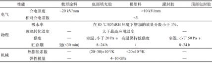 塑封材料的主要功能是电气绝缘和环境隔离,起到防潮、防盐雾、防霉、防尘、防碰撞和防振等防护作用,避免遭受环境的腐蚀与破坏,从而保证电子组件的电气性能,甚至提高高压功率模块的电压等级,避免电极放电,最终提高电子产品的可靠性[14]。塑封材料的种类和性能如表3所示,塑封材料可分为敷形涂料(Conformal Coatings)、底部填充胶(Underfills)、模塑料(Molding Compounds)、灌封胶(Potting Compounds)和顶部包封胶(Glob Tops)[14]。