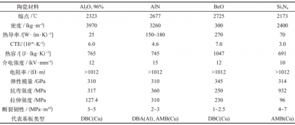 综合考虑热导率和CTE等,Al2O3、Si3N4、AlN和BeO是基板中最常用的陶瓷材料,其性能比较见表4[8,16]。BeO具有最高的热导率,但是制备过程中的微尘对人体有害,导致其应用受到很大限制。Al2O3是最经济的选择,但是机械强度适中,导热性能相对较差。AlN的热导率比Al2O3更高,CTE与芯片更匹配。Si3N4具有更高的温度循环可靠性,但成本相对较高[17]。相对而言,Al-AlN和Cu-Si3N4的组合可靠性更高,其原因是前者铝材料较软,弹性模量较低,容易变形,可以减缓热应力对陶瓷造成的损伤;后者Si3N4的抗弯强度和断裂韧性较大,可以抵抗铜带来的热应力。