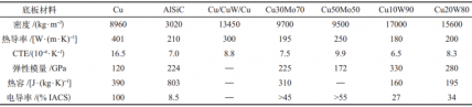 最常用的底板材料为Cu,为了降低CTE和保证高热导率,金属复合材料如AlSiC、W-Cu、Mo-Cu、以及Cu-Mo-Cu也得到广泛应用,其性能参数见表5[8]。底板一般会做镀镍处理,可以防止高温下铜原子的迁移和氧化,提高铜底板的强度和变形抗力。