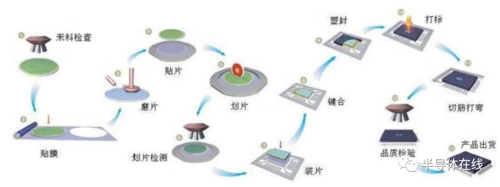 芯片封装工艺流程包括来料检查、贴膜、磨片、贴片、划片、划片检测、装片、键合、塑封、打标、切筋打弯、品质检验,最终是产品出货。在这一过程中,就需要用到封装基板、引线框架、键合丝、包封材料、陶瓷基板、粘接材料等封装材料。