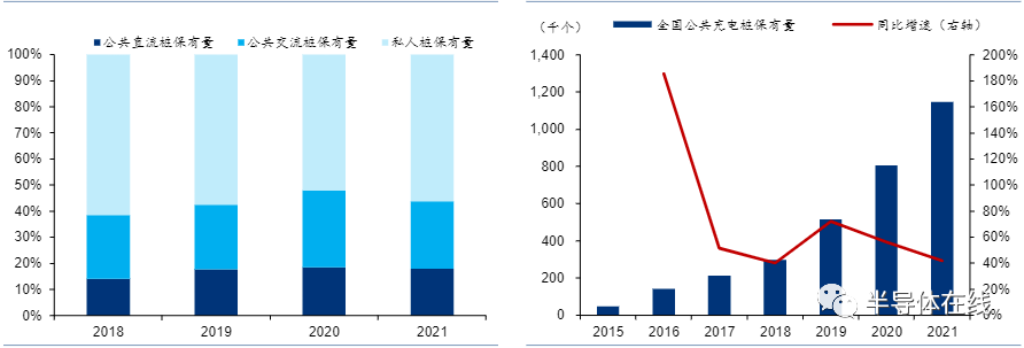 国内充电桩保有量结构(左);国内公共充电桩保有量及同比增速(右):