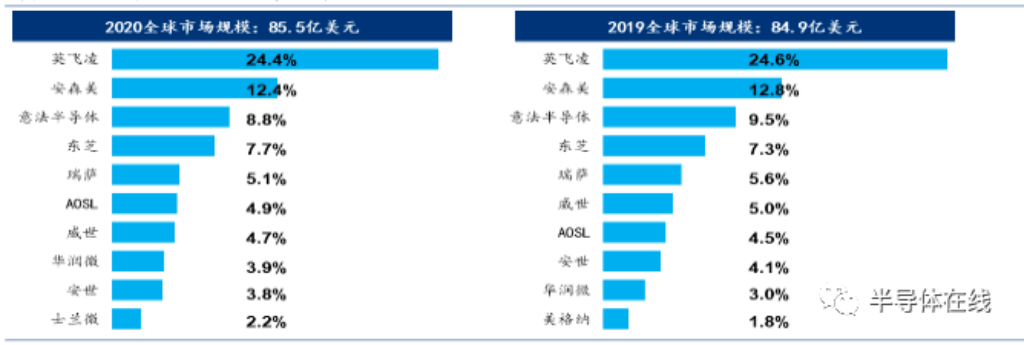 在主要细分领域中,英飞凌市场份额遥遥领先,在功率MOSFET、IGBT单管、IGBT 模块市场份额分别为24.4%、29.3%、36.5%,接下来便是安森美、意法、东芝、瑞萨、三菱等欧美日系企业。可喜的是,功率 MOSFET 市场,华润微、安世、士兰微跻身前十,IGBT 单管市场士兰微、IGBT 模块市场的斯达也都进入全球前十,虽然目前市场占有率还较低,但也说明了产品力在持续提升。
