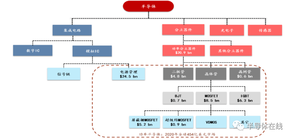 全球功率分立器件市场规模(左);全球功率器件各细分领域市场规模(右):