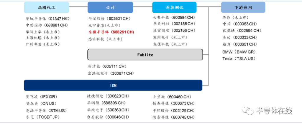 近年来国内功率半导体公司成长迅速,有以士兰微、华润微、时代电气、安世为代表的 IDM厂商,也有以斯达半导、新洁能、东微半导为代表的Fabless公司,以及IDM和Fabless 并举的扬杰科技。产品方面,士兰微、安世、扬杰科技品类较为齐全,斯达半导、时代电气聚焦 IGBT,华润微、新洁能和东微半导聚焦MOSFET,并都有所突破,士兰微做到了全球前十,斯达半导 IGBT 模块市场前十,安世MOSFET 市场前十,华润微MOSFET 市场前十。