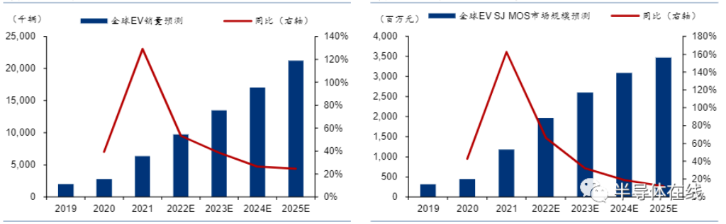 全球EV销量预测(左);全球EV 超结MOSFET市场规模预测(右):