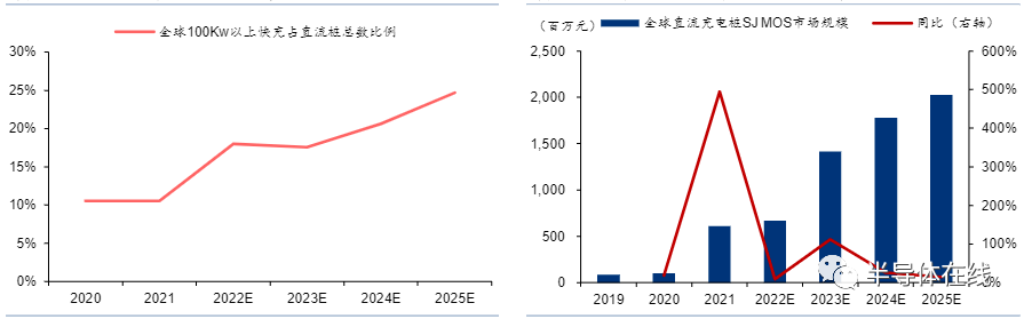 全球直流充电桩保有量预测(左);全球直流充电桩超结MOSFET市场规模预测(右):