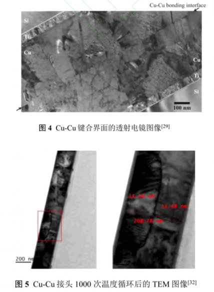 除了应用于陶瓷材料之间的键合外,表面活化键合技术还常用于金属材料之间。Takahashi等[28]研究了采用高能Ar离子束持续轰击60s以上以除去Nb表面的氧化膜(Nb2O5和NbO)和其它杂质,得到了清洁的待键合表面,为室温下超导器Nb-Nb间的SAB直接键合提供了可能。He等[29]通过表面活化键合技术将Cu-Cu在超真空室温环境下进行了键合,Cu-Cu键合界面(图4)结合良好,未见孔洞与空隙,接头结合强度达到了2.5J/m2。Wang等[30]采用氩气(混合5%氢气)等离子体预处理Si表面的Cu镀层,降低了Cu表面的氧含量,有效地提高了其表面活性,200℃下Cu-Sn连接界面无缺陷,接头剪切强度最高可达8MPa。He等[31]将含甲酸(HCOOH)的蒸汽通入流动氩气中并对Cu进行表面活化,在180℃左右到了剪切强度高达100MPa的Cu-Cu接头。Chua等[32]在Ar/N2等离子体环境下将Cu表面进行活化并在室温下键合,250℃退火后Cu-Cu接头平均剪切强度最高可达20.3MPa,接头经过-40~125℃的1000次温度循环后,暴露的Cu表面虽被严重氧化,但接头仍能很好地结合(图5)。