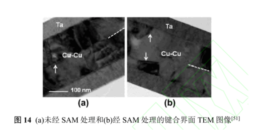 Lykova等[48]采用SAM对Cu表面进行钝化并在-40℃保存一周,发现其表面几乎没有发生氧化现象,长链SAM(十六烷基硫醇)比短链(六烷基硫醇)对Cu表面的保护作用更有效,且SAM的保护作用随其链长的增加和温度的降低而增加;他们还分别使用电化学沉积(ECD)和经过SAM钝化后物理气相沉积(PVD)制备了两种类型的Cu基板,并在250℃的低温下实现了Cu-Cu键合,PVDCu-Cu接头在连接时间为45min时的剪切强度最高,均值达到了196MPa[49]。Wang等[50]提出了一种新型等离子体自组装单层膜(PcSAM)预处理方法以改善电镀Cu的表面性能,PcSAM(六烷基硫醇)预处理后Cu表面的氧含量降低至1.39%,仅在200℃条件下就实现了Cu-Sn键合,剪切强度高达68.7MPa。Tan等[51]在镀铜硅片表面使用SAM处理,在250℃低温下得到的Cu-Cu键合接头剪切强度为54.0~65.8MPa,经过SAM(六烷基硫醇、十二烷基硫醇)处理后的键合界面可见分层面已完全消失,Cu晶粒生长布满了整个键合层(图14)。Bakish等[52]使用SAM(九烷基硫醇、十四烷基硫醇)表面处理,在120~150℃下成功键合了Si与InP,其接头剪切强度超过了表面活化键合的Si-InP接头。Ang等[53]通过SAM(十二烷基硫醇)处理Au表面,防止表面污染的同时还在键合处通过热解吸降低了封装温度,160℃下得到了平均冲击强度达到了26.9g的Au-Au接头。Lim等[54]在250℃低温下键合了SAM处理的Cu-Cu表面发现,由于键合前长链SAM(十二烷基硫醇)不完全解吸,短链SAM(六烷基硫醇)处理的样品剪切强度最佳。Liu等[55]通过在烧结之前的Cu基板上进行SAM表面处理(十八烷基硫醇)以抑制纳米Ag氧化,280℃下使用烧结纳米Ag得到的Cu-Cu接头剪强度达12.72MPa,远高于未采用SAM处理时的3.77MPa。Ghosh等[56]使用SAM(丙烷基硫醇)处理Cu表面,其接触角急剧降低,表面由亲水性变为疏水性,用He等离子体解吸SAM层后Cu表面接触角进一步降低,在200℃低温、4kN键合压力下得到了最大载荷为800N的Cu-Cu接头。