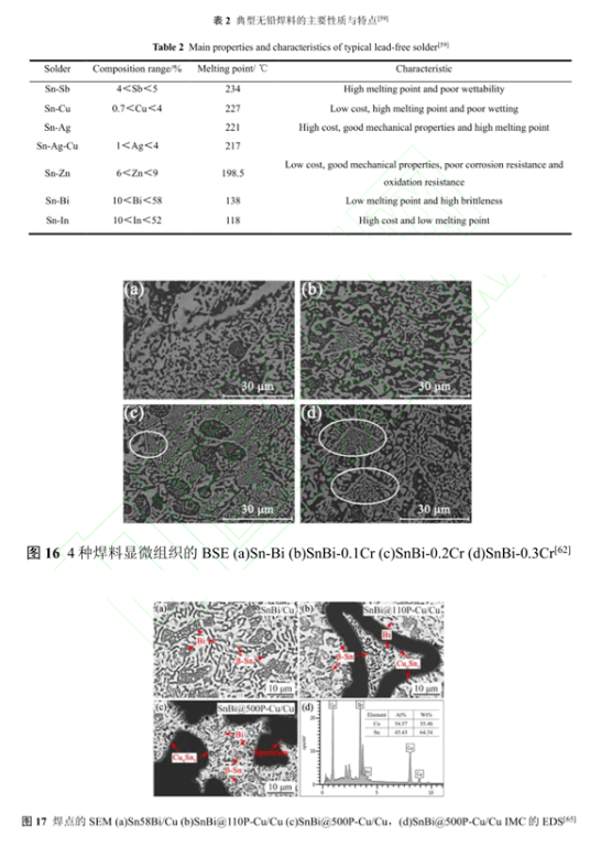 传统的Sn-Pb焊料具有成本低、熔点低、湿润性好等优点,能满足各类电子产品的使用,但Sn-Pb焊料中Pb属于有毒重金属,会对人体和环境造成极大危害。早在2006年,欧盟就颁布了ROHS禁令,规范电子电气产品的材料及工艺标准,使之更加有利于人体健康及环境保护,其中重点规定了Pb的含量不能超过0.1%[59]。随着人们环保意识的增强,以SAC305为主的Sn-Ag-Cu焊料因具有良好的抗蠕变性能和抗跌落性能,且环境性表现优异,逐渐代替Sn-Pb焊料成为市场的主流,但Sn-Ag-Cu焊料熔点较高,且在连接过程中容易生成脆性的Ag3Sn,降低接头可靠性;还有研究者熔炼并研究了Sn-4.0Bi-3.7Ag-0.9Zn焊料[60],该焊料具有较高的显微硬度和抗拉强度,但也存在熔点(202℃)较高的问题,难以符合电子封装向低温化发展的趋势。故寻找一种低熔点、高可靠性、环境友好型的低温焊料目前已成为电子封装行业亟待解决的问题(典型无铅焊料见表2[59])。