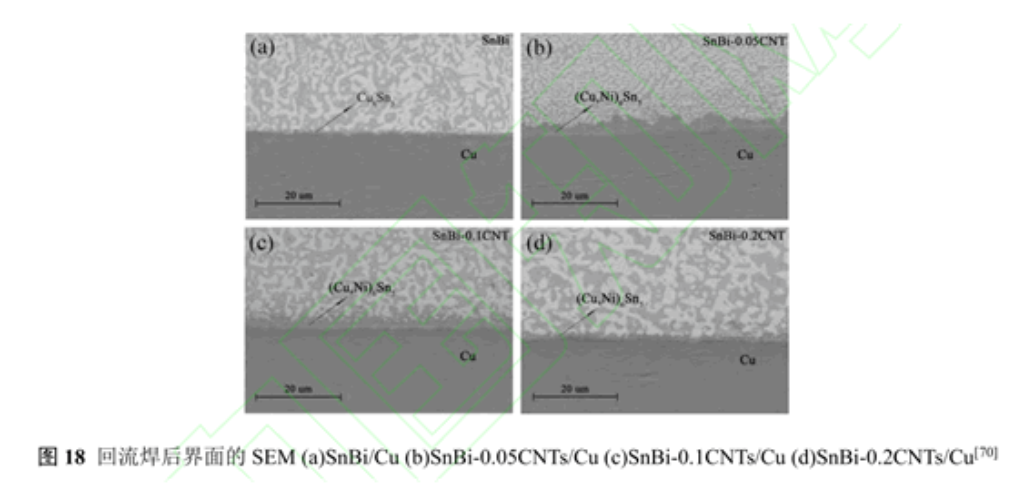 除了向低温焊料中掺杂一种或多种金属元素以及金属粒子外,还可以在焊料中加入纳米材料以改善其性能。Ma等[67]将石墨烯纳米片(GNSs)加入Sn-Bi焊料中,发现GNSs添加量为0.03wt.%时,焊料的显微组织和力学性能表现最佳,在100℃时效360h后SnBi-0.03GNSs的粗大组织和生长晶粒得到有效抑制,其抗拉强度和弹性模量较Sn-Bi焊料分别提高了15%和24%。Peng等[68]研究了纳米粒子对Sn-Bi焊点机械性能的影响,发现添加微量SiC纳米粒子能显著提高Sn-Bi/Cu焊点的力学性能,SiC纳米颗粒可以防止位错滑动,同时细化晶粒,还能降低裂纹源产生的概率,提高塑性。Ma等[69]将碳纳米管(CNTs)和石墨烯纳米片(GNSs)加入Sn-Bi焊料后,发现它们可以连接两个富Bi相晶粒或直接嵌入富Bi相中,起到了很好的钉扎和缓冲作用,能减少应力集中导致的断裂,改善了焊点的机械性能。Yang等[70]报道了涂有Ni的碳纳米管(Ni-CNTs)对Sn-Bi焊料性能的影响,发现当Ni-CNTs添加量为0.05wt.%时焊料的晶粒最细,焊点的抗拉强度达到最大值,而后随着Ni-CNTs含量的增加其焊点的抗拉强度下降(图18)。