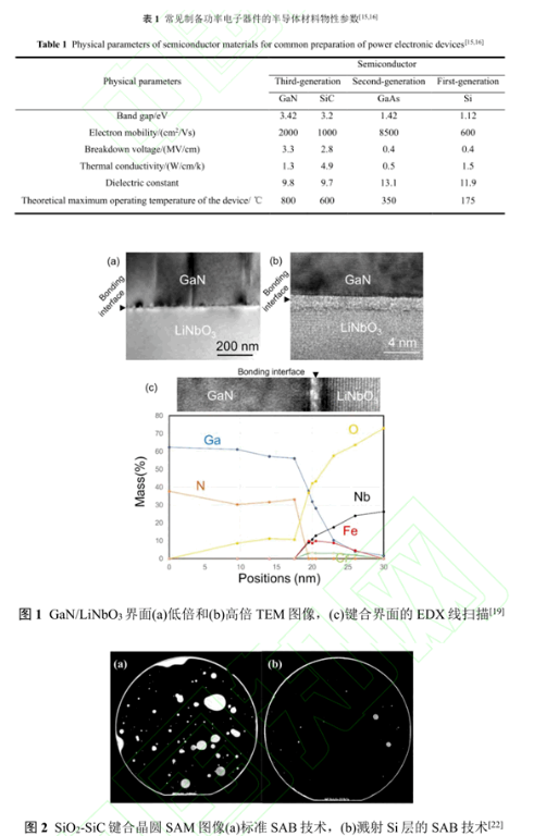 随着5G技术及大功率电子的迅速崛起与普及,以GaN、SiC为代表的具有禁带宽度大、击穿场强大、介电常数小、电子饱和漂移速度高、绝缘性能好等优异物理性能的第三代半导体(物性参数见表1[15,16])应运而生,高温、高频、大功率和高密度等极端工作环境对低温封装提出了新要求,诸多文献报道表明表面活化键合技术很好地契合了这些封装需求。如Mu等[17]采用氩离子束轰击GaN与Si表面,发现离子束轰击后的GaN表面有轻微的光滑效应,GaN-Si的结合强度与传统硅强度相当。Liang等[18]利用表面活化键合技术在室温下成功制备了GaN-金刚石异质接头,GaN/金刚石界面存在较小的压应力,但明显小于由晶体生长形成的GaN-on-diamond结构。Ryo等[19]采用含铁氩离子束轰击GaN和LiNbO3,沉积的含Fe中间层在LiNbO3表面和GaN表面间形成了牢固的结合(图1),在室温条件下得到了抗拉强度26MPa的键合接头。Mu等[20]采用溅射沉积Si中间层的表面活化键合技术,仅在室温条件下就实现了GaN与更高导热率的单晶CVD金刚石衬底的键合;采用对SiC表面进行活化并溅射沉积Fe-Si中间层,在室温条件、4MPa压强下得到了剪切强度为18MPa的SiC-Si接头[21];在SiO2表面溅射Si层并采用表面活化键合技术,极大减少了界面孔洞,SiC表面和溅射Si层后SiO2表面的粗糙度分别为0.25nm和0.33nm,溅射Si层使SiO2-SiC键合界面(图2)的表面能从0.2J/m2提高到2.4J/m2,成功实现了室温条件下SiC与SiO2之间的键合[22]。Ryo等[23]使用Ar离子束快速轰击SiC和LiNbO3表面进行活化,在室温条件下将其表面直接接触进行键合,测得SiC-LiNbO3接头的剪切强度为11MPa。Kang等[24]使用O2对SiC和Si基衬底进行持续时间60s左右的表面活化,然后在不到200℃的低温条件下成功得到了SiC-SiO2、SiC-Si和SiC-玻璃的无空隙、稳定键合接头。