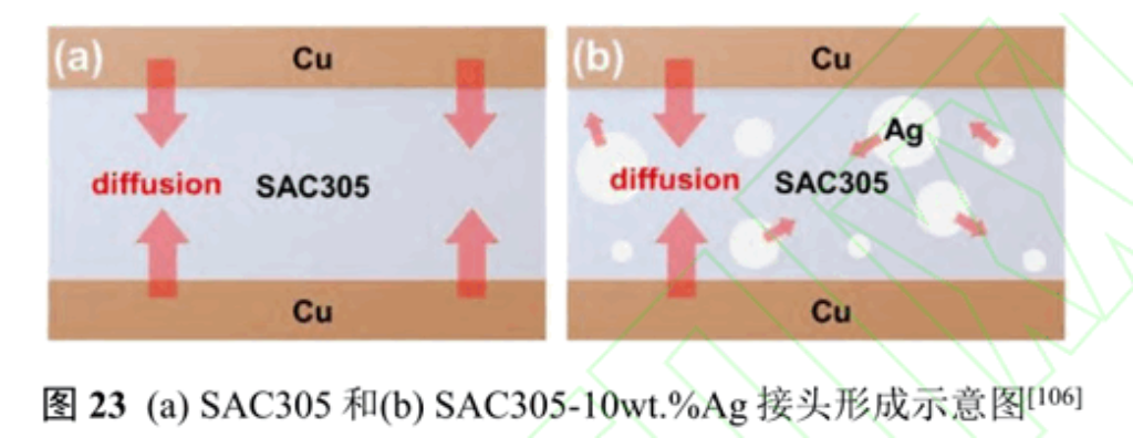 直接形成全IMC接头的研究也有很多,如董红杰等[103]采用厚度40μm的纯Sn焊料作为低熔点的中间层,在Ni和Cu基板间实现了低温瞬时液相连接,延长等温反应时间获得了完全由(Cu,Ni)6Sn5和Cu3Sn两种IMC组成的焊接接头,在Ni-CuTLP接头的Sn/Ni和Sn/Cu界面处均形成了(Cu,Ni)6Sn5,从Ni侧到Cu侧化合物形貌依次是小颗粒状、针状和扇贝状,接头具有418.4℃的重熔温度和49.8MPa的平均剪切强度,能够满足高温功率器件封装中对耐高温互连的需求。Liu等[104]研究了超声辅助TLP连接快速形成Cu-Sn全IMC接头,焊料夹层由厚度为20mm的低熔点单一纯Sn箔制成,与传统TLP连接工艺形成的IMC接头相比,该接头Cu6Sn5晶粒明显细化,平均尺寸为3.5mm,弹性模量和硬度分别约为123GPa和6GPa,剪切强度高达60.1MPa。Sun等[105]将具有微孔的Cu片(厚1mm)浸渍到液态Sn中制备成混合焊料从而作为低熔点的中间层,在300℃和0.6MPa压强条件下,Cu/Cu3Sn/Cu全IMC接头平均剪切强度高达155MPa。Hwang等[106]采用TLP技术使用SAC305+10wt.%Ag颗粒作为低熔点中间层,在300℃低温无压条件下保温2h制备了无孔洞的Cu/Cu6Sn5/Cu3Sn/Ag3Sn/Cu全IMC接头,其接头剪切强度是SAC305接头的2.5倍,两种接头的形成如图23所示。Liu等[107]采用含有微晶Cu颗粒(6.2μm)的Sn涂层(50μm)作为低熔点中间层,在300℃低温无压条件下获得了Cu/Cu3Sn/Cu全IMC接头,未老化接头的剪切强度为24.2MPa,高于传统Pb-5Sn焊料接头的剪切强度。