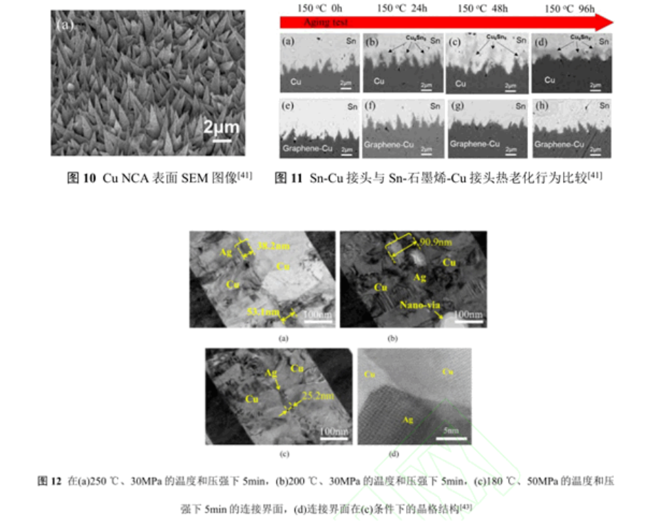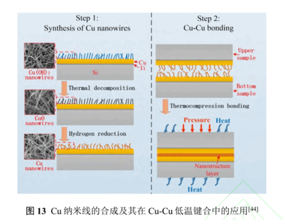 Du等[44]提出了一种新型的低温氢热分解还原方法在Cu基板上直接合成了Cu纳米线(如图13),在300℃的低温和40MPa的压强下得到了剪切强度高达44.4MPa的键合接头。Mou等[45]将异丙醇(IPA)处理后的Cu纳米膏涂覆在Cu基板上,然后在2MPa的压强、250℃和275℃的低温下进行Cu-Cu键合,得到的接头剪切强度分别达到了28.3MPa和35.1MPa。Panigrahi等[46]通过在Cu表面沉积一层3nm厚的超薄Ti层来抑制Cu的氧化,并将Cu表面的粗糙度从2.1nm降低至0.4nm,从而在160℃低温和0.25MPa低压下实现了Cu-Cu键合。Hou[47]提出了一种基于冷喷涂沉积和氧化还原工艺的新方法,首先在Cu基板上形成紧密排列的微米级Cu颗粒,然后通过氧化作用在Cu颗粒上形成Cu2O纳米粒子,在甲酸气氛中Cu2O纳米粒子被完全还原为Cu纳米粒子,最后在300℃低温、15MPa压强下得到了剪切强度最高为32.9MPa的Cu-Cu接头。
