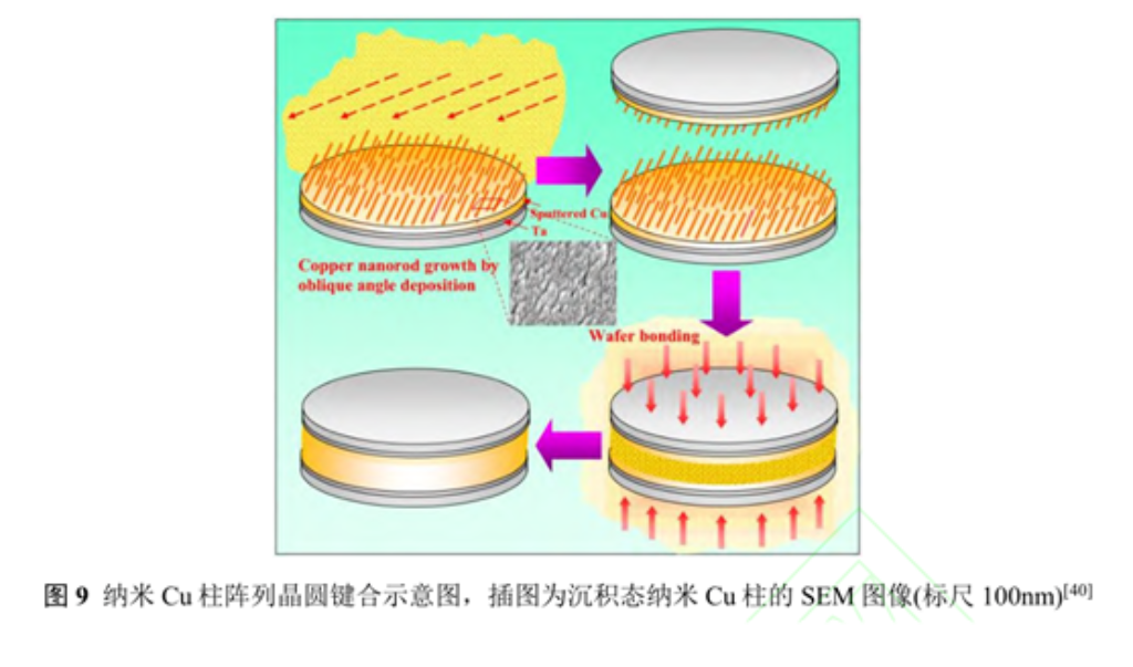 除了以上两种在母材表面形成纳米连接层方法外,也见在母材表面形成纳米尺寸结构的大量报道。如Hu等[36]提出了一种在Cu凸点上电镀一层镍锥阵列(Ni-MCAs)并与Ag层低温键合的方法,其中Ni-MCAs的平均高度为800~1000nm,在180MPa的键合压强和250℃的低温下连接20min,发现当连接温度为250℃时,Ni-MCAs有效嵌入到Ag层当中且界面没有出现空洞。Lu等[37]使用化学沉积法制备出Cu-Ni微锥阵列在190℃的低温条件下与Sn-3.0Ag-0.5Cu焊料结合,结合过程施加压力质量为500g、750g和1000g时得到的接头平均剪切强度分别为22.7MPa、32.6MPa和45.2MPa。还有相关文献[38]报道在Cu微锥表面化学镀Ag可得到具有高剪切强度的焊点,在190℃的低温下实现了Sn-3.0Ag-0.5Cu锡球焊料与Cu微锥基板(镀Ag)的热压结合,Cu微锥结构完全插入焊料当中,在结合界面上没有发现孔洞,焊点剪切强度高达43.4MPa。此外,有研究者[39]使用同样的方法在Cu微锥表面镀Sn,并在连接过程中用超声波进行辅助,成功实现了Cu-Cu之间的结合。Wang等[40]利用斜角沉积技术在Si晶片上溅射一层厚500nm的纳米Cu柱阵列(纳米柱直径为10~20nm,高度为760nm),在0.32MPa键合压强和200~400℃低温条件下就可以实现Cu-Cu的键合(图9)。