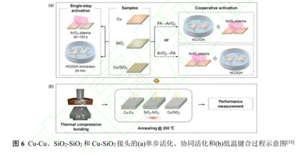 此外,Kang等[33]还提出了一种表面活化混合键合机制(活化和键合过程如图6),分别键合了Cu-Cu、SiO2-SiO2与Cu-SiO2。首先,用Ar/O2等离子体(其中O2含量为0.2%)对Cu和Si表面的热氧化物SiO2单步活化30~150s,Ar等离子体可以去除表面有机污染物和氧化物,O2等离子体可以有效提供−OH基团,在50%甲酸(FA)溶液中浸泡20min后用去离子水超声清洗30s,最后用流动的氮气干燥。Cu-Cu、SiO2-SiO2与Cu-SiO2三种样品在200℃(上压片)和25℃(下压片)的大气环境、2.5MPa压强中进行30min的热压连接,其中样品底部温度被稳定在135℃左右,结合界面的实际温度为185±3℃,随后连接样品在200℃下退火2h。结果发现当活化时间延长至120s时,Ar/O2→FA(表面活化后再甲酸处理)和FA→Ar/O2(甲酸处理后表面活化)活化得到的Cu-Cu接头最大剪切强度分别为13.46MPa和12.35MPa;对于SiO2-SiO2接头,FA→Ar/O2活化所得到样品的整体剪切强度高于Ar/O2→FA活化所得到样品,其最大剪切强度接近4MPa;使用FA→Ar/O2活化并低温键合的Cu与SiO2接头微孔较少、晶粒生长充分。
