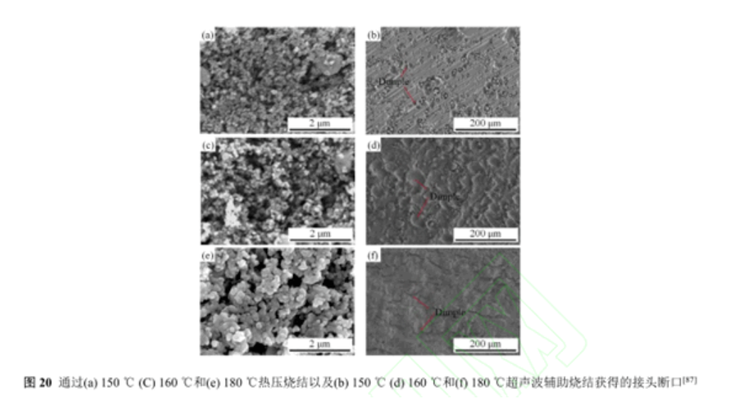 选用纳米材料作为连接材料时,可以降低封装温度并提高连接性能,此外还可以用金属膜、有机盐等包裹纳米颗粒,使颗粒表面改性形成纳米复合焊料。李明雨等[82,83]将纳米颗粒包裹上金属膜并与有机溶剂混合形成焊膏,其中一种使用Sn膜包裹纳米Ag颗粒[84],并与α-松油醇溶剂混合,在0.5MPa压强、260℃下烧结20min得到了Cu-Cu接头,其剪切强度为35.3MPa,电阻率为9.5μΩ·cm,接头性能优于未使用Sn膜包裹的烧结纳米Ag颗粒Cu-Cu接头。何鹏等[85,86]使用柠檬酸盐包裹纳米Ag颗粒形成Ag浆,柠檬酸盐与Ag离子通过形成相关配合物(如[Ag2+citrate]或[Ag3(C6H5O7)n+1]3n−)来控制Ag颗粒成核和生长,柠檬酸盐的吸附作用还能防止颗粒的团聚,加之柠檬酸盐本身所具有的较低分解温度和缩聚作用为后续烧结提供了有利条件,在260℃、1MPa压强下烧结30min得到了剪切强度为28.2MPa的Cu-Cu键合接头。Ji等[87]采用Ag包裹的纳米Cu颗粒(Cu@AgNPs)作为焊料,在160℃超声辅助烧结下实现了Cu-Cu低温互连,180℃工作时该接头剪切强度高达54.27MPa,比同等温度下热压烧结所得到的接头剪切强度(3.91MPa)高了一个数量级,且随着烧结温度的升高,接头断口的韧窝尺寸越来越大,Cu@AgNPs逐渐形成块状组织,其中Ag为网格结构均匀地分散在Cu基体表面(图20)。Haque等[88]使用辛硫醇包裹纳米Cu颗粒并形成焊膏(10wt.%Cu),将焊膏涂覆在玻璃基板上进行烧结,还原性H2与纳米Cu颗粒表面的辛硫醇反应,促进了纳米Cu颗粒之间烧结颈的形成,从而使烧结致密度更高,H2环境下烧结得到的样品电阻率最低为5.8×10−6Ω·cm。