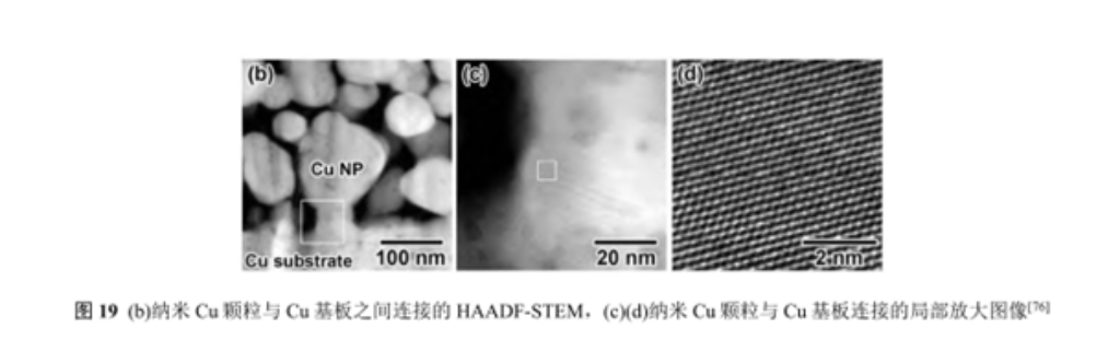 常见的纳米焊料除了纳米Ag外,对于纳米Cu的相关报道也有许多。Yoichi等[76]在室温条件下,用水合肼还原乙酸铜(II)络合物的水溶液,成功获得平均粒径为50~60nm的纳米Cu颗粒(NPs),利用金属掩膜及丝网印刷将纳米Cu颗粒涂覆到玻璃基板上,并在200℃N2气氛下无压烧结30分钟,测得烧结纳米Cu电阻率为16μΩ·cm,与以往研究相比该烧结温度下Cu电阻率非常低,Cu-Cu接头剪切强度高达39MPa(TEM图像见图19)。由于纳米Cu极容易氧化生成Cu2O或CuO,尽管氧化物能使烧结接头更为致密进而提高接头的剪切强度[77],但对接头的导电率却是不利的。为了解决上述问题,Yu等[78]提出了一种激光烧结工艺,将纳米Cu颗粒(100~120nm)涂覆在玻璃基板上并用激光进行烧结,烧结得到的样品电阻率最低为5.3μΩ·cm,远低于200℃热压烧结得到的样品电阻率(122μΩ·cm)。此外,王春青等[79,80]还提出了一种使用Cu6Sn5纳米颗粒作为焊料,在200℃低温、5MPa压强下烧结20min得到了界面均匀、无孔隙的Cu-Cu接头。Cu6Sn5具有熔点高达415℃、与Cu基板的热膨胀系数几乎相同、导电导热性良好、抗剪切强度高等特点[81],脆性的Cu6Sn5通过纳米化的途径可以转化为非脆性、超塑性和耐高温的焊料,这种方法有望广泛应用于其他IMC,如Cu-Sn、Ni-Sn、Ag-Sn、Zn-Sn、Cu-Al等。