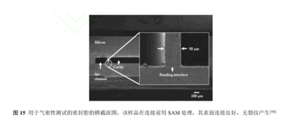 当SAM表面处理应用于电子封装当中时,除了能保护母材表面不受氧化和污染以及降低封装温度外,还能有效提高连接接头的电学性能。Peng等[57]使用未经SAM处理和经过SAM(六烷基硫醇)处理的Cu表面进行键合,未经SAM处理的接头接触电阻值约为3.53mΩ,而经过SAM处理后接头接触电阻平均值降低了7.1%,约为3.28mΩ。此外,Lim等[58]还采用SAM(六烷基硫醇)处理,在250℃低温、5500N键合压力条件下得到了Cu-Cu热压接头,接头密封空腔(横截面如图15)具有良好的气密性,泄漏率低于10-9atmcm3/s,与未经SAM处理的对照样品相比至少提高了29%,比MILSTD-883标准定义的5×10-8atmcm3/s小了一个数量级。
