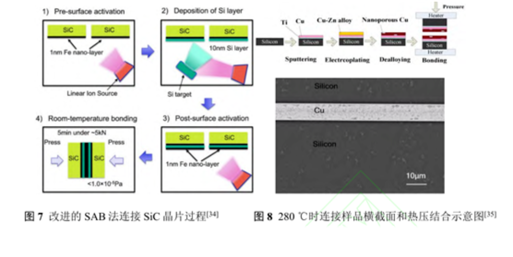在电子封装中,除了母材表面活化外,还可以在母材表面溅射纳米连接层或形成纳米尺寸结构,利用纳米材料特殊的物化性质,同样也能达到降低封装温度、提高连接可靠性的目的。如Suga等[34]首先用Ar离子束轰击晶片表面,清除污染物和氧化层,同时在晶片表面溅射1nmFe粘结层;然后,用离子束溅射法在Fe粘结层上沉积10nmSi中间层;之后,再用Ar离子束轰击活化Si中间层,同时在Si中间层上再沉积1nmFe粘结层;最后在真空条件为10-5Pa、5kN压力的室温下,使活化表面相互接触300s得到了键合强度高于32MPa的SiC-SiC接头,过程如图7所示。又如Cai等[35]先在Si衬底上溅射50nm的Ti镀层和500nm的Cu镀层,再电镀上Cu-Zn合金,随后使用去合金化法去除Cu-Zn合金中的Zn,从而制备出具有纳米多孔结构的Cu表面层,在280℃、300N的压力条件下对两块经相同方法处理的Si衬底进行连接,样品平均拉伸强度达到8MPa,其连接层的横截面和工艺流程如图8所示。