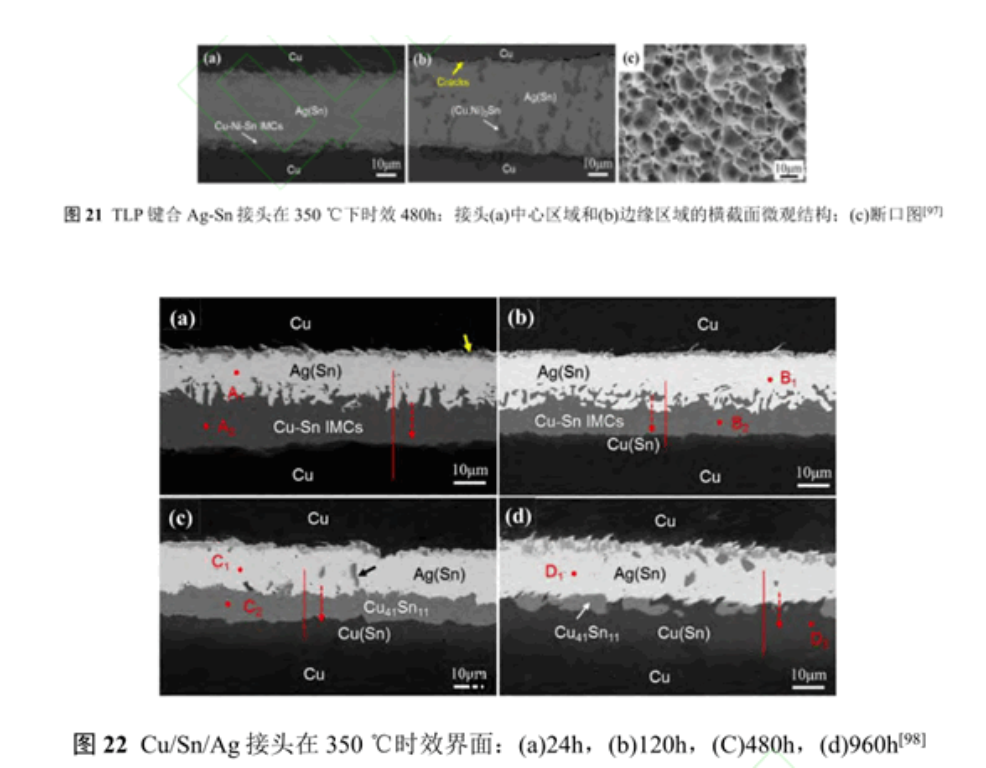 除了纳、微颗粒混合形成混合焊料外,在瞬时液相连接(TLP)技术中,也常应用到混合焊料。瞬时液相连接(TLP)是在被连接母材中间加入低熔点的中间层,使中间层与部分母材表面反应,或在中间层中加入其它金属颗粒以及其它中间层形成混合焊料,在加热过程中中间层与母材部分熔化,通过重新凝固或扩散作用生成高熔点的金属间化合物或固溶体而形成连接的过程。一些研究表明在TLP键合过程引入Ag作为低熔点中间层材料,会在焊缝中形成固溶体。Shao等[97]应用TLP技术在280℃低温下得到了Ag-Sn接头,采用厚度为20μm的工业纯Sn箔作为焊料中间层,350℃时效120h后接头内的Ag3Sn晶粒或ζ相完全转变为Ag-Sn固溶体,接头剪切时发生韧性断裂;时效时间延长到240h后,Sn在Ag-Sn固溶体层中的分布更加均匀;时效延长到480h后(图21a),Cu衬底和Ag金属层之间的Ni缓冲层被完全消耗,Cu或Ni在初生Ni-Sn或Cu-SnIMC中表现出相当大的溶解性,Ni-SnIMC逐渐演变为Cu-Ni-SnIMC,大量(Cu,Ni)3Sn颗粒在接头边缘区域的Ag-Sn固溶体层内沉淀,并产生连续的Sn固溶体层内裂纹(图21);时效1000h后,接头没有发生严重的断裂,仍然具有约40MPa的高剪切强度。还有文献报道[98]在Cu/Sn/Cu互连结构中引入低熔点的Ag,在300℃和0.3MPa压强下保温420min制备了由Cu3Sn+Ag3Sn+Ag4Sn组成的TLP接头;350℃老化24h后,Ag3Sn完全转变为Ag-Sn固溶体,Cu-SnIMC层由Cu3Sn+Cu41Sn11组成;时效480h后,Cu3Sn+Cu→Cu41Sn11的转变结束,当时效时间增加到960h后Cu-Sn固溶体在许多区域与Ag-Sn固溶体密切接触(图22),在时效近1000h后,接头仍然保持较高的剪切强度(>40MPa),表明接头具有良好的热可靠性。