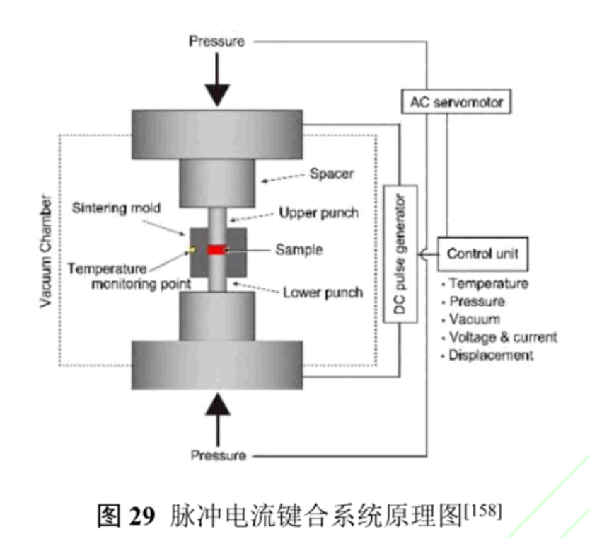 脉冲电流键合[158],又称火花等离子烧结,常用于激光透明材料或大尺寸材料的连接,键合过程如图29。该技术是通过脉冲电流与压力在真空中的共同作用降低键合温度,工艺参数包括键合高度、施加压力和加热速度等。Lin等[159]首次使用摩擦电纳米发电机(TENG)来驱动阳极键合,虽然阳极键合技术已广泛应用于微机电系统(MEMS)封装或太阳能电池封装,但是传统的键合电源需要高电压和大电流,在键合过程中产生了巨大的能量损耗,限制了阳极键合的广泛应用。基于TENG的阳极键合系统具有更低的电流和更少的转移电荷要求,在350℃和TENG的驱动下,100mm2的Si/玻璃界面可以在30s内紧密结合,剪切强度为15.38MPa,而利用TENG驱动的两步阳极键合法得到的Si/玻璃/Si接头可靠性良好,最大剪切强度达到了8.49MPa。Xin等[160]使用脉冲电流键合(SPS),成功实现了Cu纳米晶与Si3N4(Ti镀层)的连接,由包含Ti4Cu2O(Ti3Cu3O)的Cu层和Ti2O层所形成的两层结构的接头具有最好的结合性能,剪切强度达到了42.93N/cm2。
