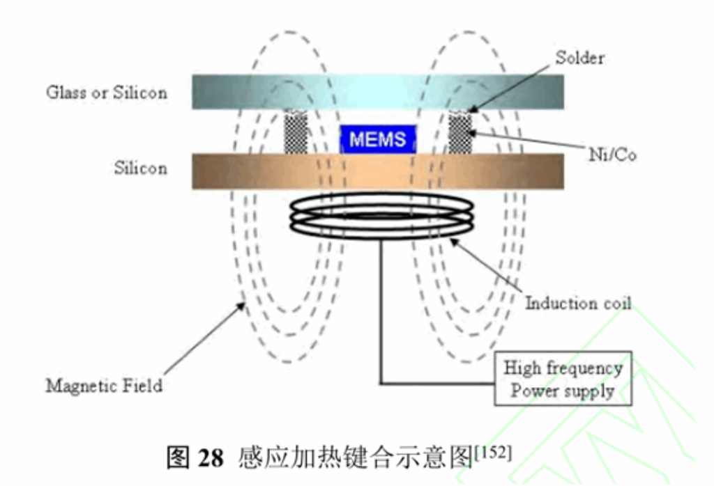 微机电系统(MEMS)是在日常生活中广泛应用的微尺度器件,其大量应用于生物医学、汽车和航空航天、通信、电力和能源等方面。Yang等[152]报道了一种用于MEMS器件晶圆级封装的新型键合方法如图28所示,采用电磁线圈对Si衬底上的电镀磁膜(Ni-Co合金)进行局部感应加热,当温度达到183℃时,Ni-Co合金表面的Sn-Pb镀层熔化,在1min内就能得到剪切强度高于18MPa的Si-Si键合接头,充分减少了高温对MEMS器件带来的影响。目前,MEMS器件的典型设计原则是其组件表面避免接触,因为接触表面摩擦所产生的粘滞现象对于器件来说是致命的。对此,Gkouzou等[153]在MEMS设备上加入了感应线圈,对其接触表面进行局部加热,只需将一个表面加热到300℃以上,就可以将表面的粘附力从500nN降低到200nN,在降低表面粘附力的同时还保证了MEMS器件不受到高温的影响。