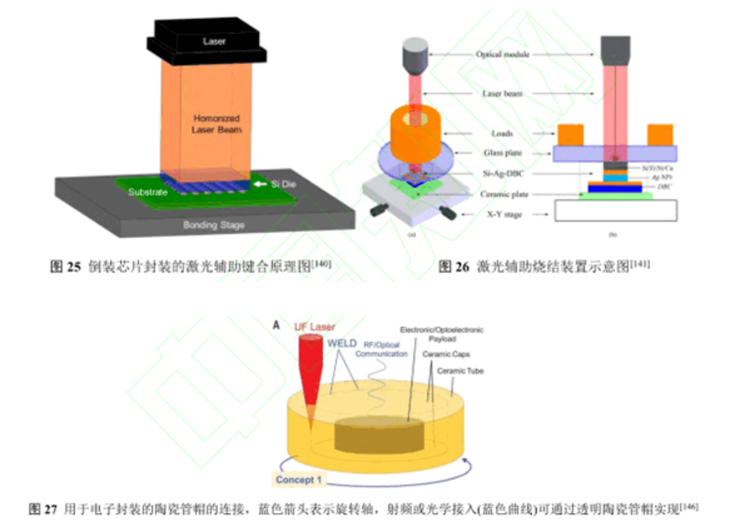 飞秒激光应用于电子封装领域的第二个作用是利用激光产生的巨大热量,达到瞬时加热的目的,激光瞬时加热具有功率密度高、加热迅速和热影响区小等优点。Jang等[140]使用激光辅助键合技术(LAB)将Cu凸点与Si晶片进行连接(图25),在LAB过程中Si晶片所吸收的激光光能被转换为热能,然后热量通过晶片传导到下方的Cu凸点和SAC305焊料中,将焊料瞬间加热至熔化温度,而后冷却至室温完成键合。Liu等[141]使用激光辅助烧结纳米Ag颗粒的方法键合Si片与Cu衬底(图26),增大外加压力、激光功率、烧结温度以及辐照时间可直接提高接头的剪切强度,在3MPa压强、70W激光功率和1min极短辐照时间下键合接头的剪切强度达到了10MPa,5min时剪切强度可达到20MPa,与常规几十分钟烧结所得到的接头剪切强度相当。Furuya等[142]采用激光功率为6kW、移动速度为200mm/min,在15L/min流通量的Ar气保护下实现了Al-Cu激光钎焊,焊料中加入Ni后接头强度由原来的61MPa提升到100MPa。Kim等[143]提出了一种快速、高效的玻璃(熔融SiO2)微流体器件制造工艺,玻璃基板在氢氟酸(HF)中刻蚀20~30min后再使用脉冲能量为2.7µJ、移动速度为20mm/s的飞秒激光对其进行连接,其接头可承受至少1.4MPa的压强且没有任何泄漏或破裂,这比传统的聚二甲基硅氧烷(PDMS)/玻璃接头或PDMS/PDMS接头所能承受的最大压强高3.5倍。Richter等[144]使用超短飞秒激光焊接熔融SiO2,他们将飞秒激光脉冲聚焦到两个接触的熔融SiO2样品界面上,激光在聚焦位置产生瞬时局部热量,优化工艺参数后得到的SiO2接头达到了SiO2块状材料破断应力的75%。Chambonneau等[145]采用皮秒超快激光对Si、Cu进行连接,减少了Si的非线性效应,在9.8ps的脉冲持续时间下获得了剪切强度为2.2MPa的连接接头。Penilla等[146]采用不同脉冲长度的激光进行ZrO₂陶瓷之间的连接(图27),发现采用飞秒脉冲长度的中转速(50(°)s−1)连接的接头剪切强度最低约为7MPa,使用皮秒脉冲长度的低转速(30(°)s−1)得到的接头剪切强度平均为17MPa,使用皮秒脉冲的中转速(50(°)s−1)得到的接头剪切强度约为40MPa,获得的接头最高剪切强度与700~900℃的高温下陶瓷与金属的扩散连接获得的接头相当。